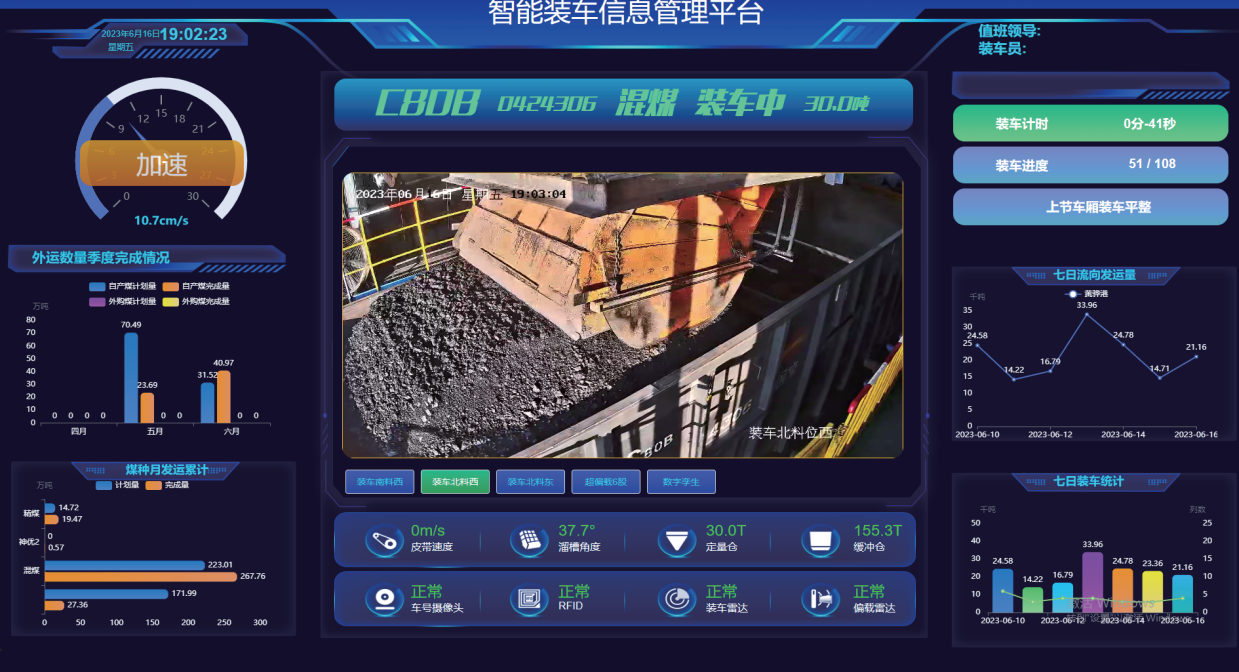 在整个装车过程中,除开始需要人工完成装车 准备,激活AI控制系统外,无需人工操作,自动 完成配料, 自动控制溜槽放料装车, 自动发送 调速指令,指挥司机或控制铁牛牵引速度配合 装车。
